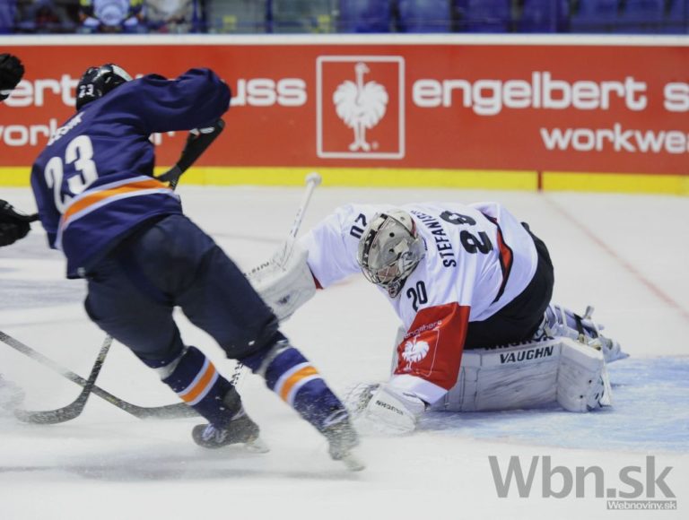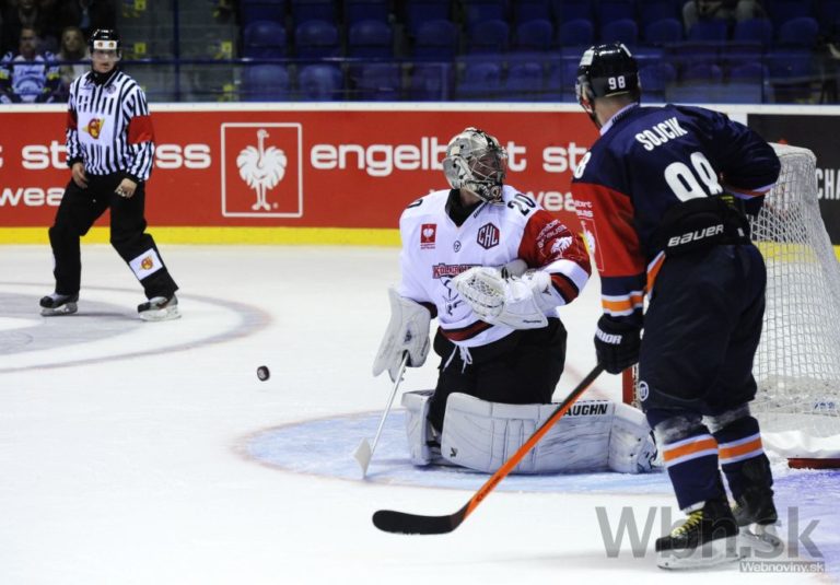 Zľava: Matej Češík z Košíc a Sebastian Stefaniszin z Kolína v zápase HC Košice (SR) - Kolín Haie (Nem.) 6. kola hokejovej Ligy majstrov 2014/2015. Košice, 8.október 2014. Foto: SITA/Ivan Fleischer