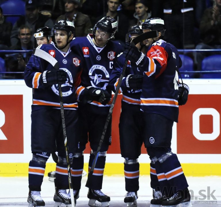 Gólová radosť košických hráčov v zápase HC Košice (SR) - Kolín Haie (Nem.) 6. kola hokejovej Ligy majstrov 2014/2015. Košice, 8.október 2014. Foto: SITA/Ivan Fleischer