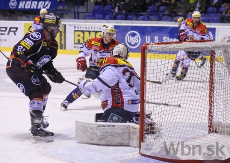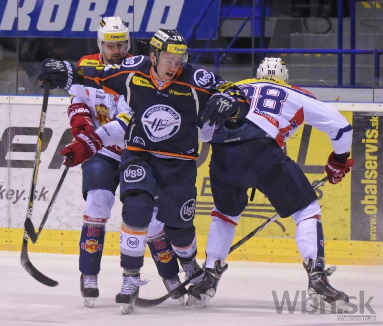 Zľava: Lukáš Jurík zo Zvolena Juraj Cebák z Košíc a Lubor Pokovič zo Zvolena v zápase 45. kola hokejovej Tipsport extraligy medzi HC Košice - HKM Zvolen. Košice, 27. január 2015. Foto: SITA/Tibor Zmak