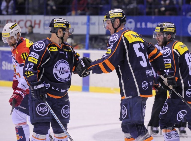 Zľava: Jiří Bicek a Radek Philipp z Košíc oslavujú gól v zápase 45. kola hokejovej Tipsport extraligy medzi HC Košice - HKM Zvolen. Košice, 27. január 2015. Foto: SITA/Tibor Zmak
