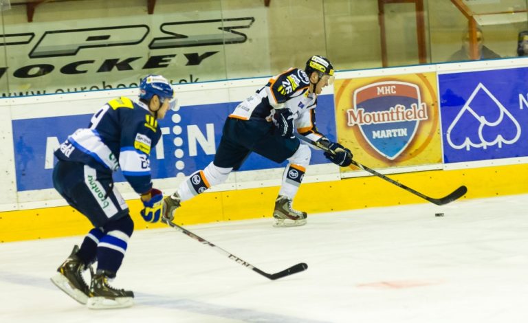 Zľava Juraj Cebák (Košice) a Milan Kolena (Martin) počas zápasu medzi MHC Martin a HC Košice. Martin, 12. marec 2014. Foto: SITA/Milo Fabian