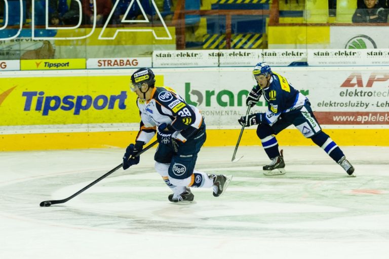 Zľava:Tomáš Hrnka (Košice) a Robert Marton (Martin) počas zápasu medzi MHC Martin a HC Košice. Martin, 12. marec 2014. Foto: SITA/Milo Fabian