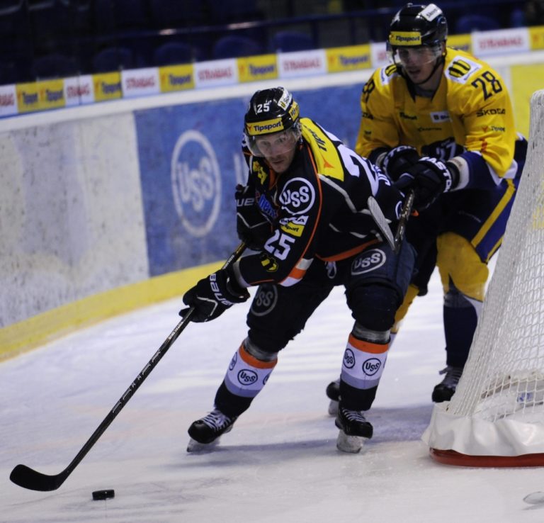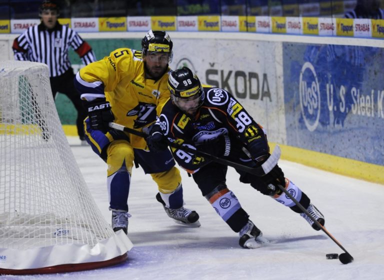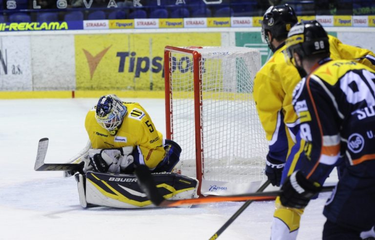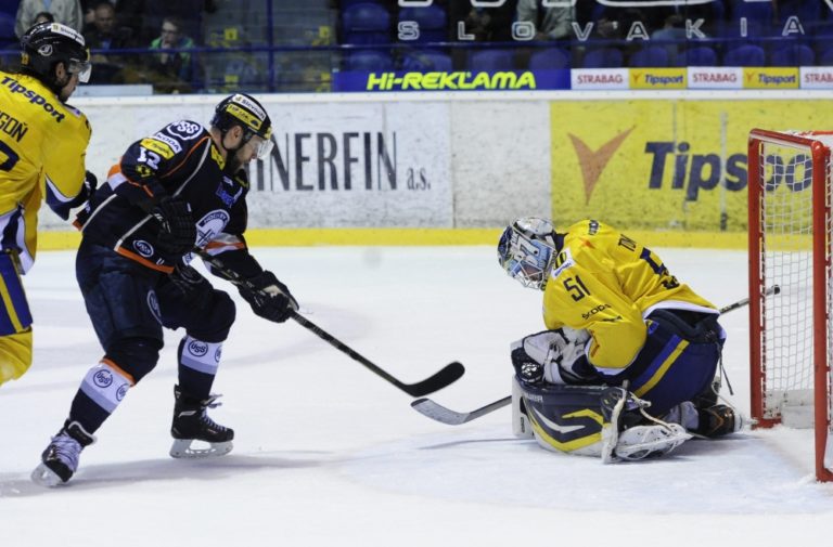 Tomáš Tomek (vľavo) z Piešťan v piatom semifinálovom zápase HC Košice - ŠHK 37 Piešťany play-off hokejovej Tipsport extraligy. Košice, 1. apríl 2014. Foto: SITA/Ivan Fleischer