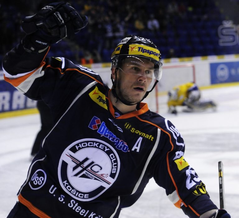 Richard Jenčík z Košíc sa teší z gólu v piatom semifinálovom zápase HC Košice - ŠHK 37 Piešťany play-off hokejovej Tipsport extraligy. Košice, 1. apríl 2014. Foto: SITA/Ivan Fleischer