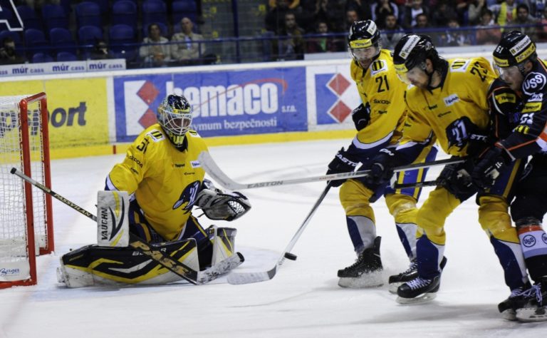 Zľava: Tomáš Tomek, Richard Filip a Adam Drgoň z Piešťan a Marek Bartánus z Košíc v piatom semifinálovom zápase HC Košice - ŠHK 37 Piešťany play-off hokejovej Tipsport extraligy. Košice, 1. apríl 2014. Foto: SITA/Ivan Fleischer