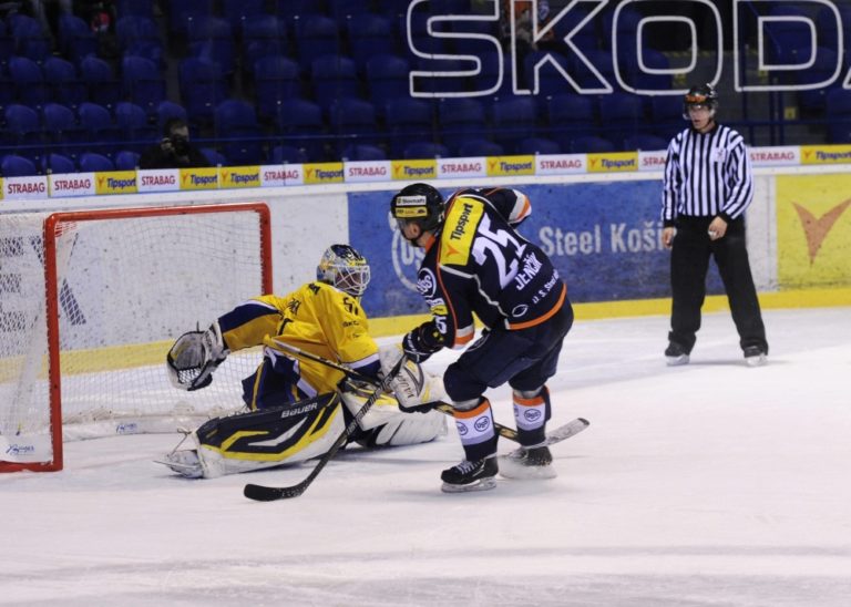 Zľava: Matej Cuník z Piešťan a Peter Sojčík z Košíc v piatom semifinálovom zápase HC Košice - ŠHK 37 Piešťany play-off hokejovej Tipsport extraligy. Košice, 1. apríl 2014. Foto: SITA/Ivan Fleischer