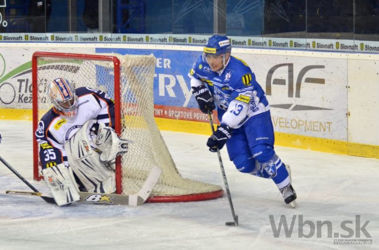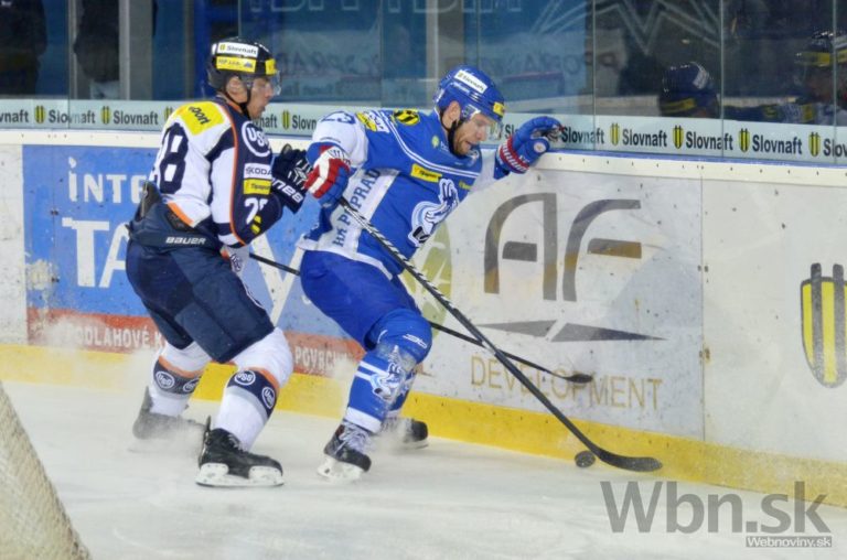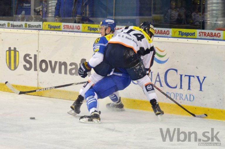 Zľava: Lukáš Paukovček z HK Poprad a Erik Černák z HC Košice počas zápasu 16. kola Tipsport extraligy medzi HK Poprad - HC Košice. Poprad, 24. október 2014. Foto: SITA/Radoslav Maťaš