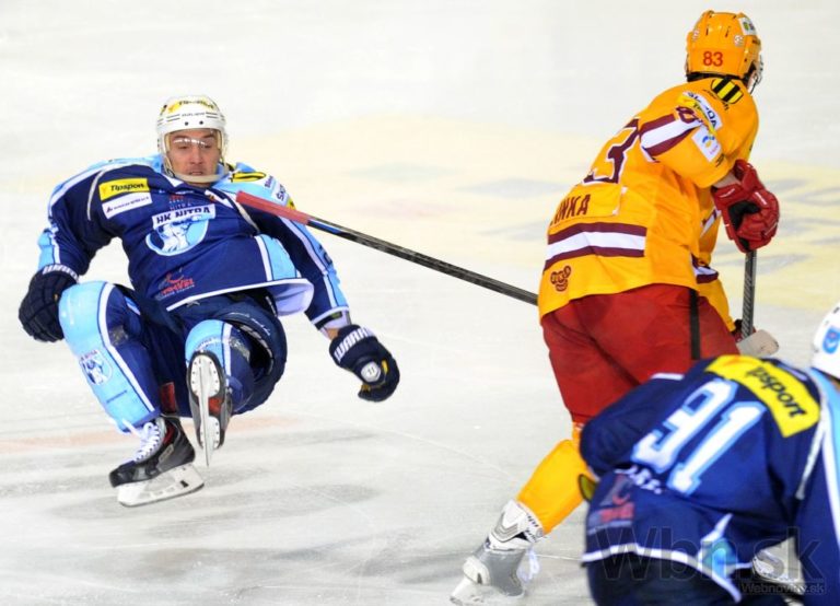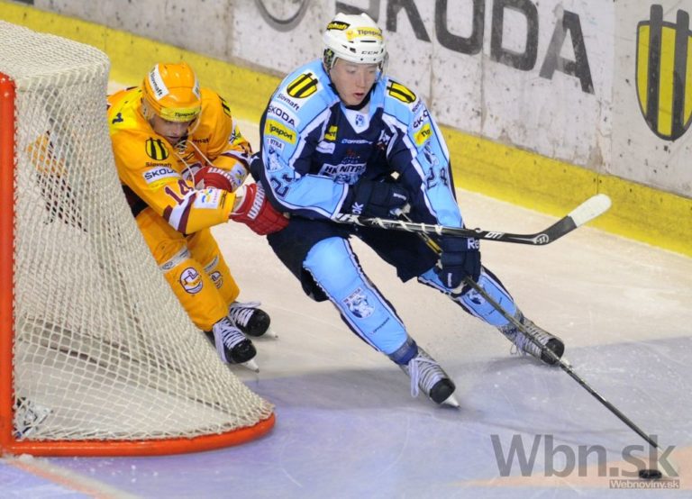 Michal Novák z HK Nitra (vpravo) a Peter Novajovský z Dukly Trenčín (vľavo) počas 16. kola slovenskej hokejovej Tipsport extraligy 2014/2015 medzi HK Nitra - Dukla Trenčín. Nitra, 24. október 2014. Foto: SITA/Martin Havran