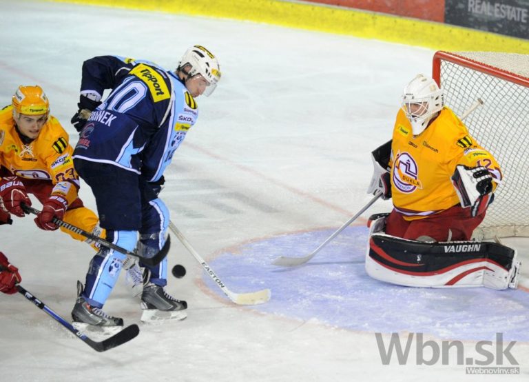 Roman Tománek z HK Nitra (v strede), Michal Hlinka (vľavo) a brankár Branislav Konrád (vpravo) z Dukly Trenčín počas 16. kola slovenskej hokejovej Tipsport extraligy 2014/2015 medzi HK Nitra - Dukla Trenčín. Nitra, 24. október 2014. Foto: SITA/Martin Havran