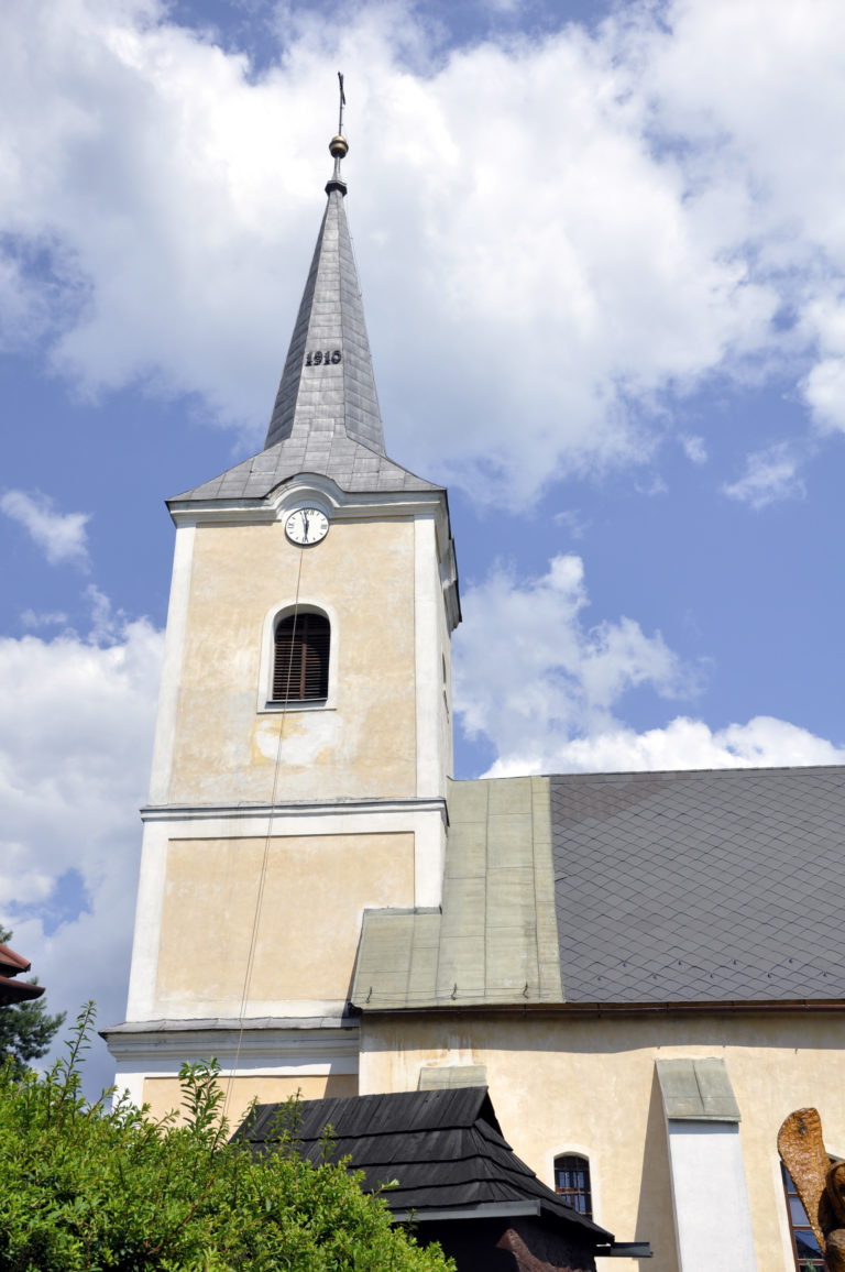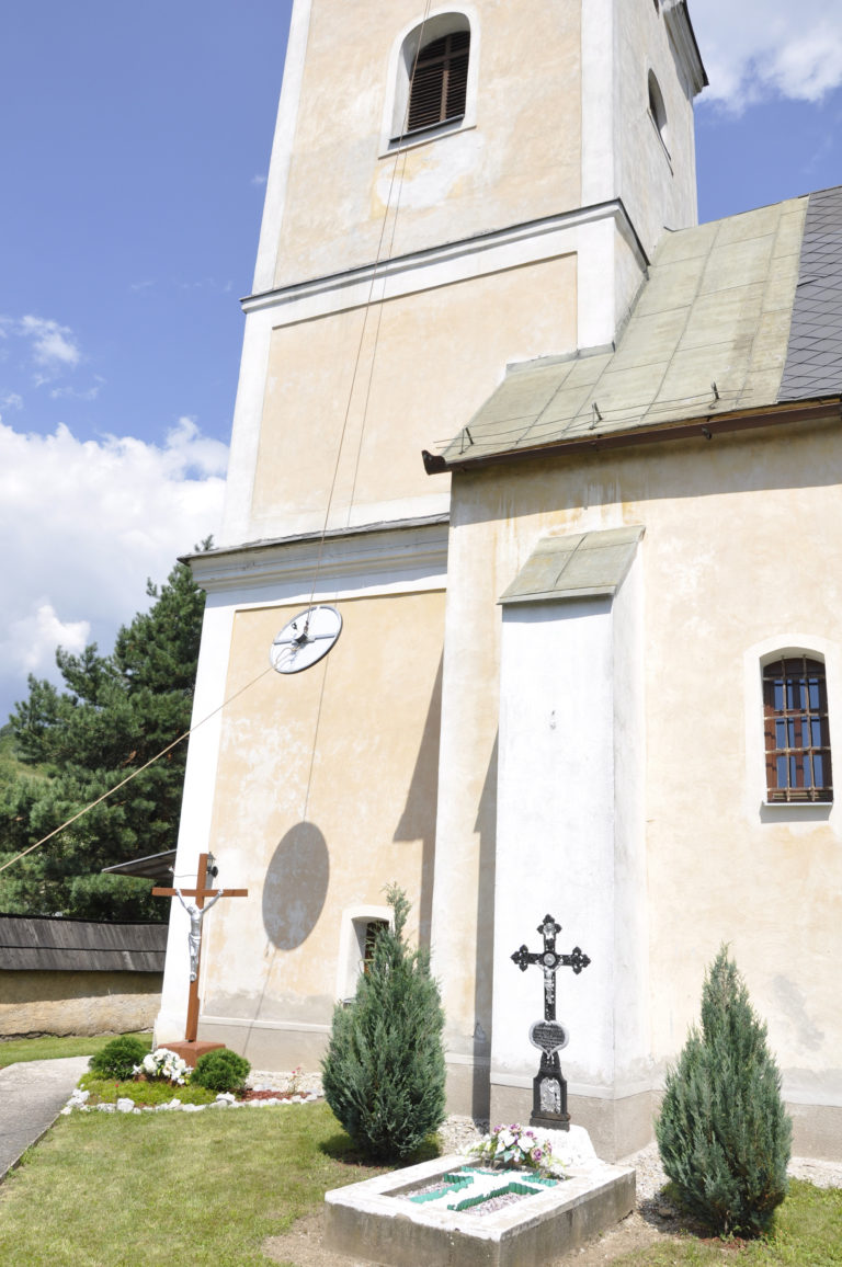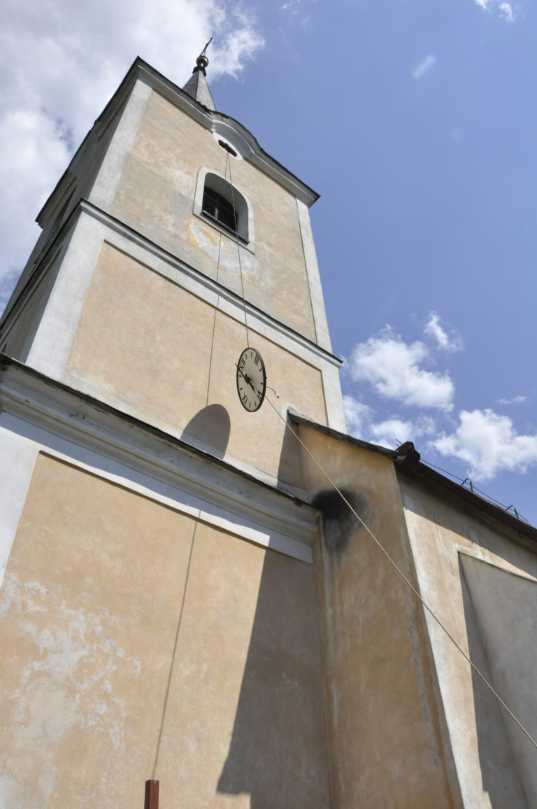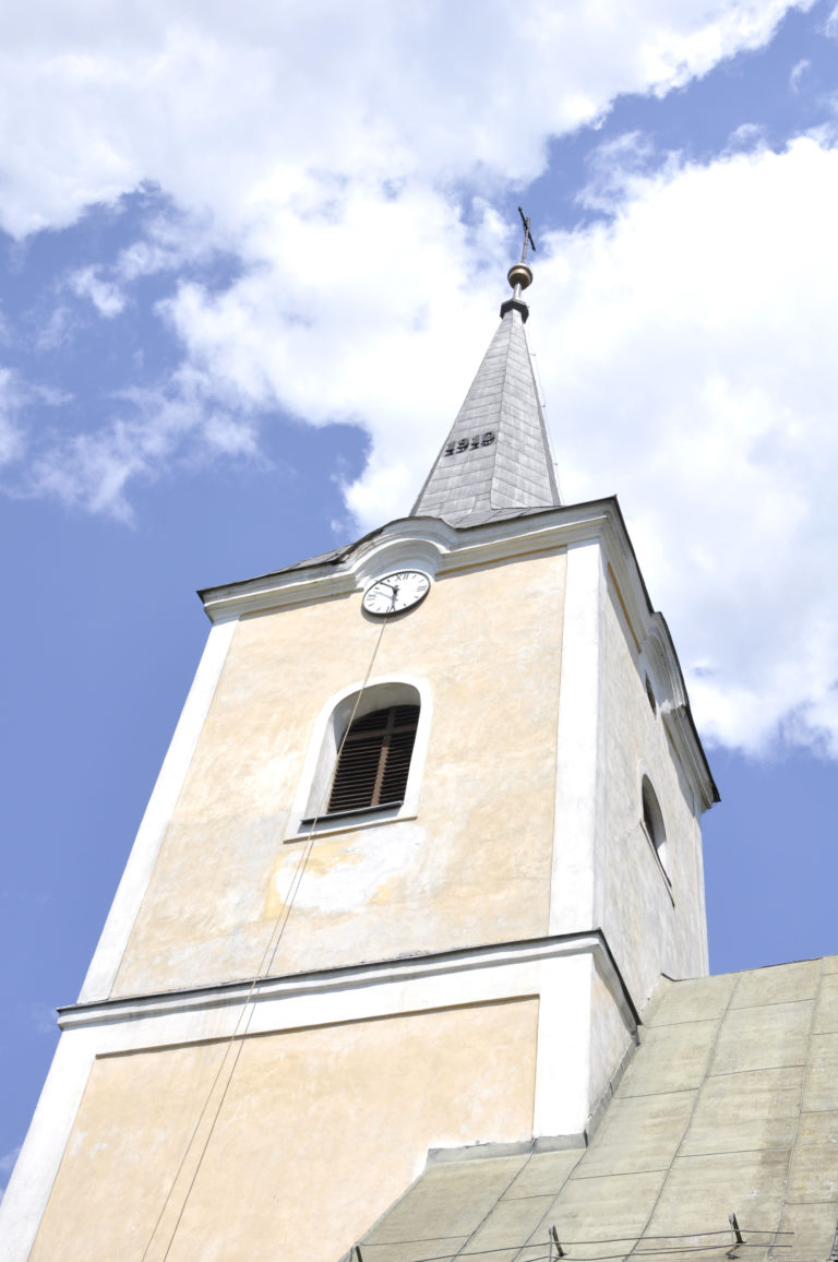 Pohľad na rímskokatolícky kostol svätého Michala v Muránskej Dlhej Lúke počas inštalácie vežových hodín na všetky štyri svetové strany. Špeciálne hodiny, ktoré patria k najmodernejším svojho druhu darovala miestnemu kostolu veriaca rodina z obce. Muránska Dlhá Lúka, 18. júl 2017. Foto: SITA/Pavol Beňo