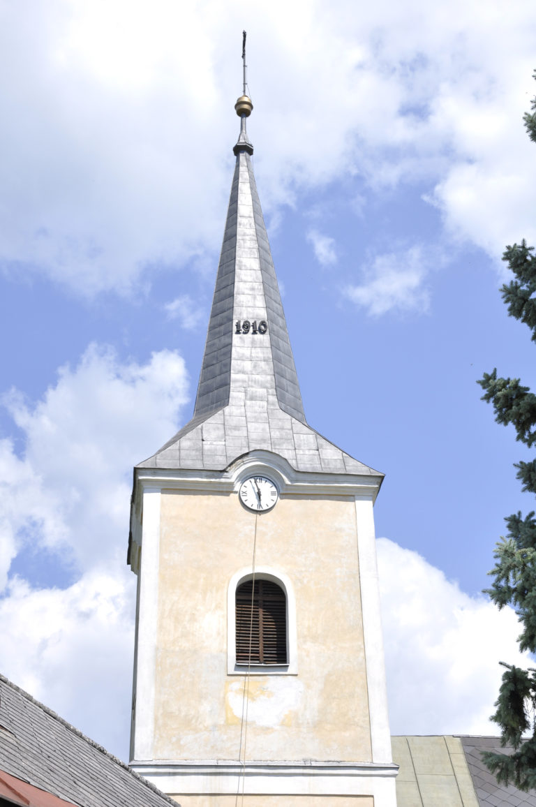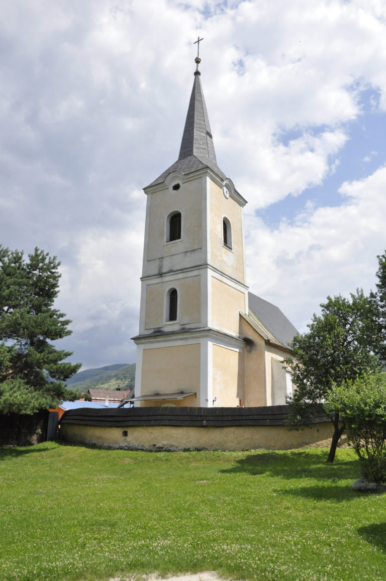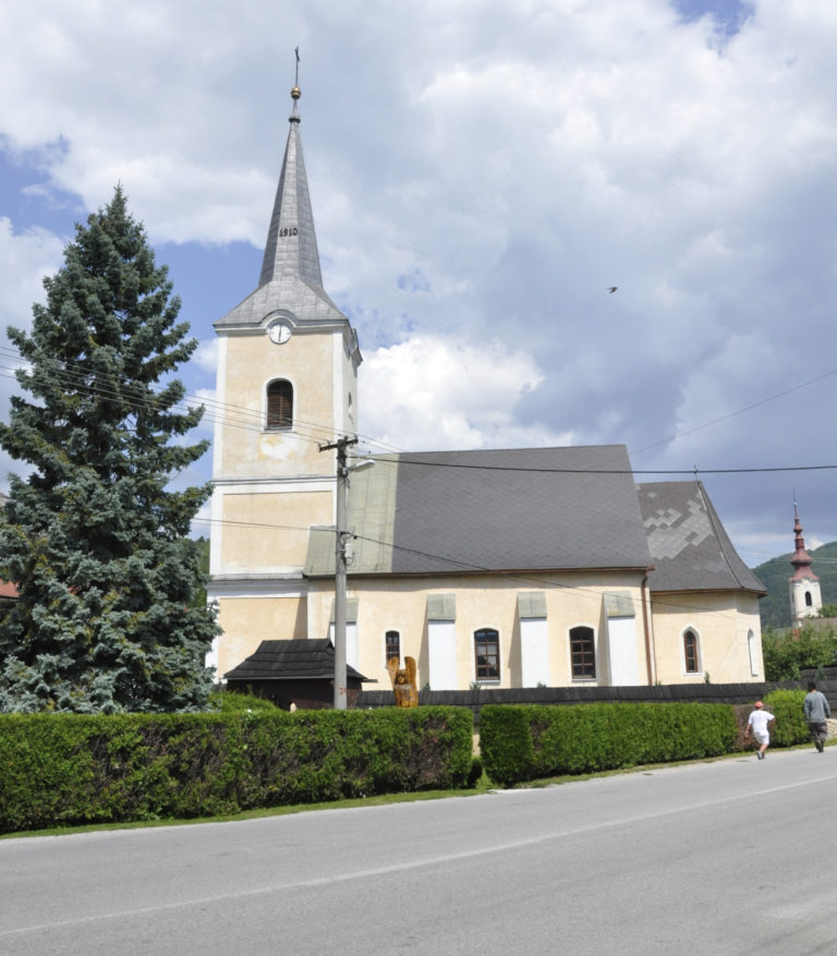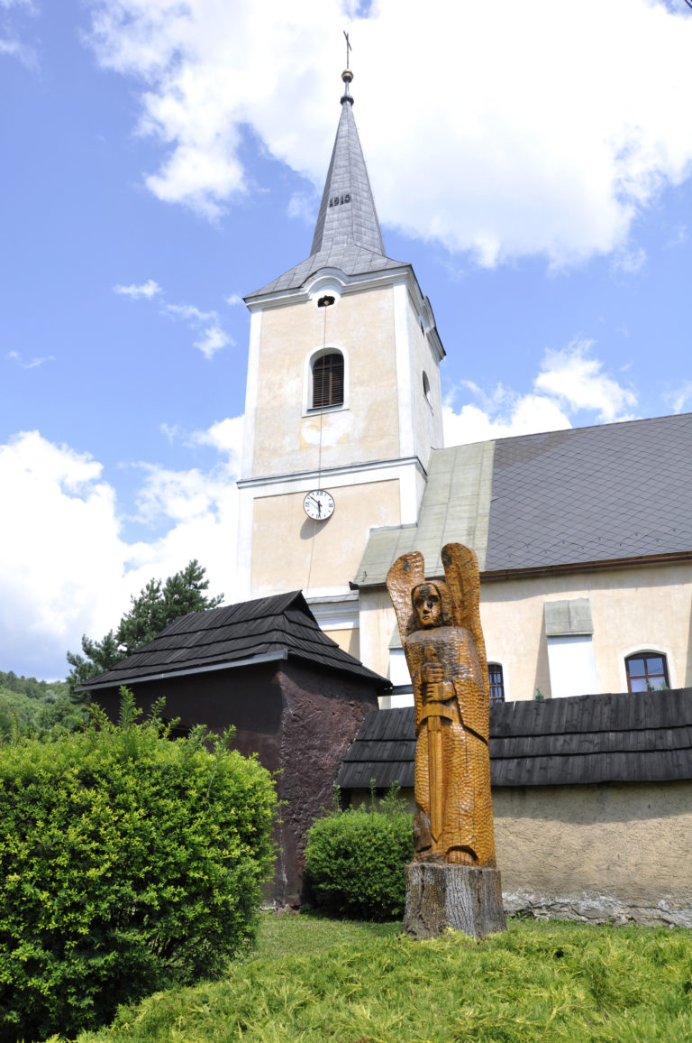 Pohľad na rímskokatolícky kostol svätého Michala v Muránskej Dlhej Lúke počas inštalácie vežových hodín na všetky štyri svetové strany. Špeciálne hodiny, ktoré patria k najmodernejším svojho druhu darovala miestnemu kostolu veriaca rodina z obce. Muránska Dlhá Lúka, 18. júl 2017. Foto: SITA/Pavol Beňo