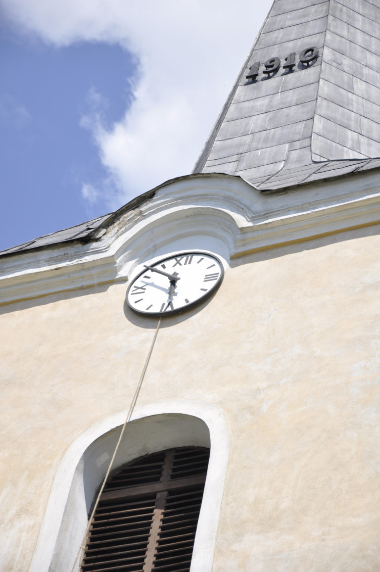 Inštalácia vežových hodín na všetky štyri svetové strany na rímskokatolíckom kostole svätého Michala v Muránskej Dlhej Lúke. Špeciálne hodiny, ktoré patria k najmodernejším svojho druhu darovala miestnemu kostolu veriaca rodina z obce. Muránska Dlhá Lúka, 18. júl 2017. Foto: SITA/Pavol Beňo