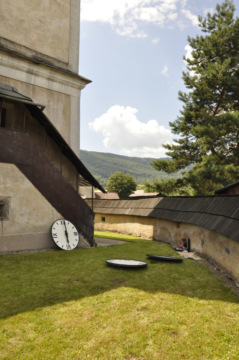 Pohľad na vežové hodiny, ktoré budú umiestnené na všetky štyri svetové strany na rímskokatolíckom kostole svätého Michala v Muránskej Dlhej Lúke. Špeciálne hodiny, ktoré patria k najmodernejším svojho druhu darovala miestnemu kostolu veriaca rodina z obce. Muránska Dlhá Lúka, 18. júl 2017. Foto: SITA/Pavol Beňo