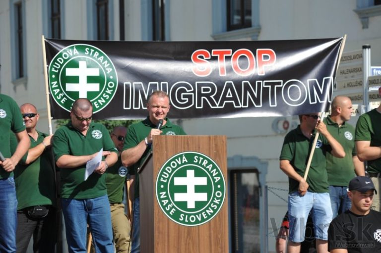 Podpredseda strany ĽS Naše Slovensko Rastislav Schlosár (druhý zľava) počas príhovoru v rámci protestu proti ignorovaniu referenda o umiestnení imigrantov v Gabčíkove. Organizátorom protestu je ĽS Naše Slovensko. Trnava, 1. september 2015. Foto: SITA/Ivan Kopčáni