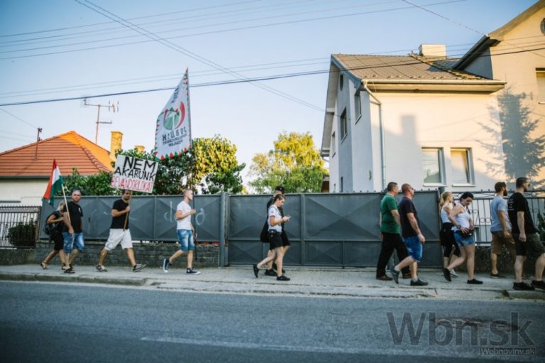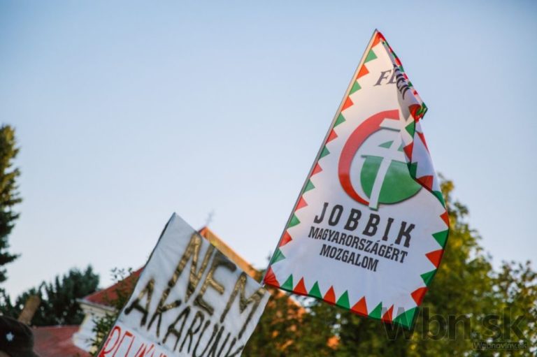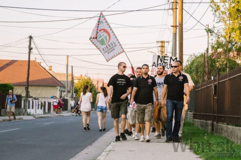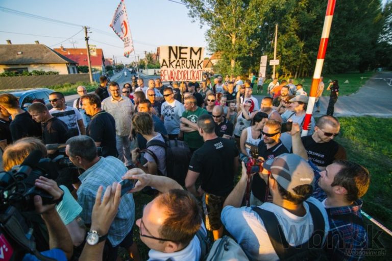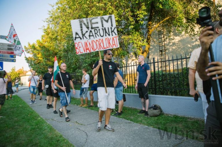 Sympatizanti strany Jobbik počas protestu proti ignorovaniu referenda o umiestnení imigrantov v Gabčíkove. Gabčíkovo, 1. september 2015. Foto: SITA/Marko Erd