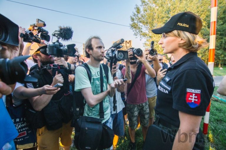 Hovorkyňa KR PZ v Trnave Martina Kredatusová (vpravo) počas rozpúštania protestu proti ignorovaniu referenda o umiestnení imigrantov v Gabčíkove. Gabčíkovo, 1. september 2015. Foto: SITA/Marko Erd