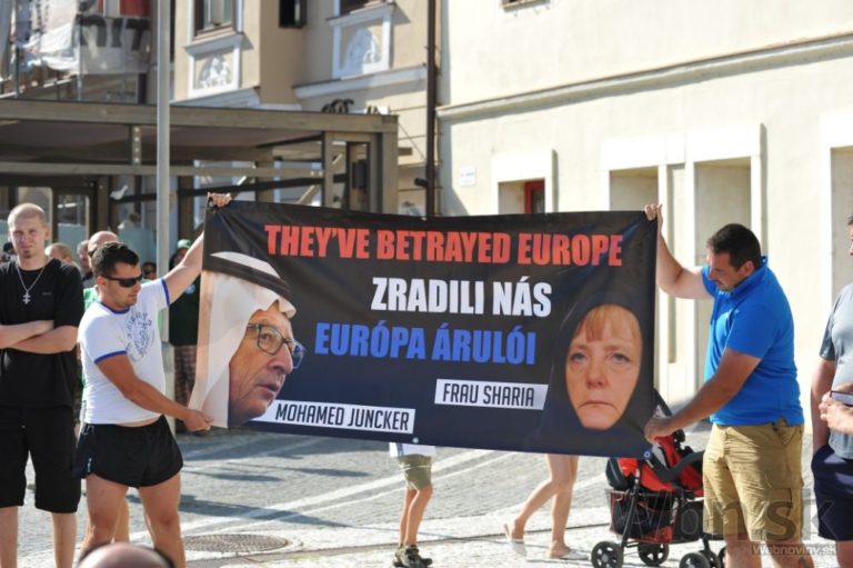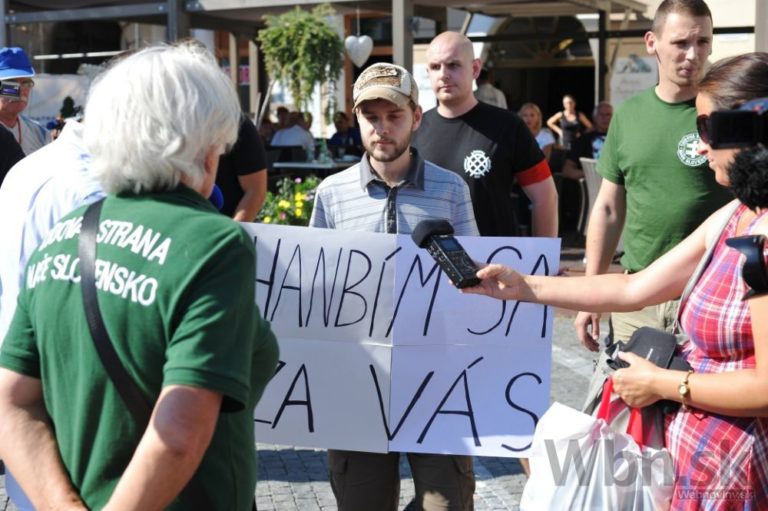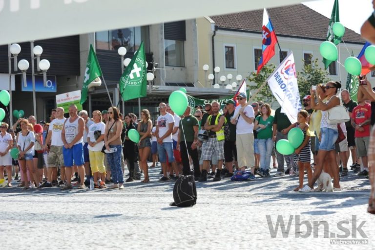 Účastníci protestu proti ignorovaniu referenda o umiestnení imigrantov v Gabčíkove. Organizátorom protestu je ĽS Naše Slovensko. Trnava, 1. september 2015. Foto: SITA/Ivan Kopčáni