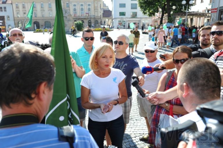 Poslankyňa NR SR za stranu Smer-SD Renáta Zmajkovičová (uprostred) odpovedá novinárom počas protestu proti ignorovaniu referenda o umiestnení imigrantov v Gabčíkove. Organizátorom protestu je ĽS Naše Slovensko. Trnava, 1. september 2015. Foto: SITA/Ivan Kopčáni