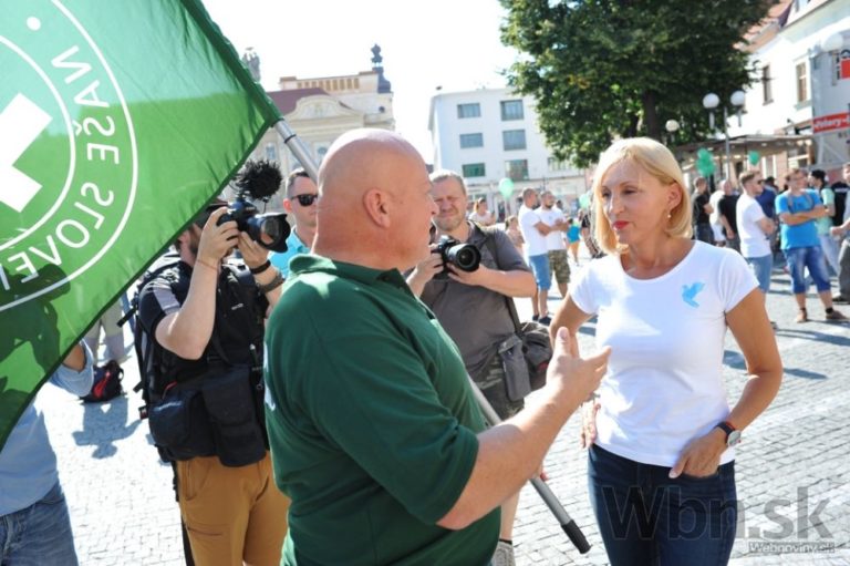 Poslankyňa NR SR za stranu Smer-SD Renáta Zmajkovičová (vpravo) v diskusii počas protestu proti ignorovaniu referenda o umiestnení imigrantov v Gabčíkove. Organizátorom protestu je ĽS Naše Slovensko. Trnava, 1. september 2015. Foto: SITA/Ivan Kopčáni