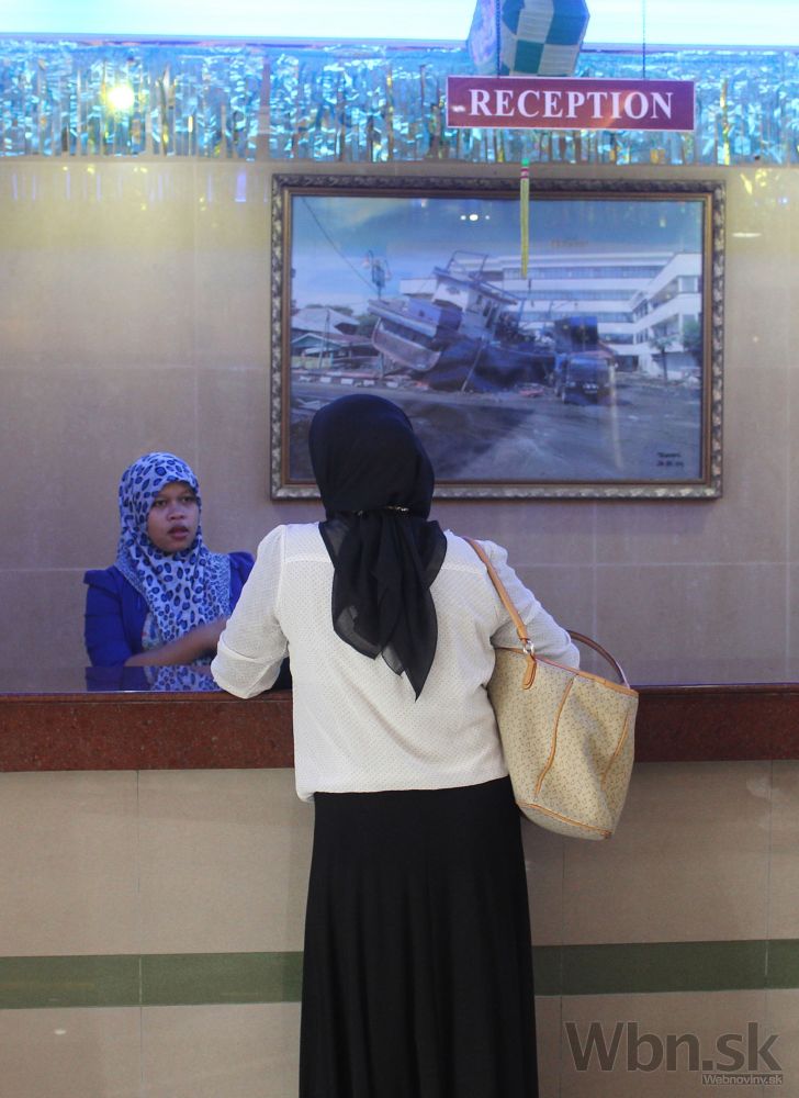 Žena sa prihlasuje na recepcii v hoteli, za pultom ktorej visí zarámované fotografia zničených lodí po ničivej vlne cunami spred 10 rokov. Indonézia, Banda Aceh, 12. augusta 2014. Foto: SITA/AP