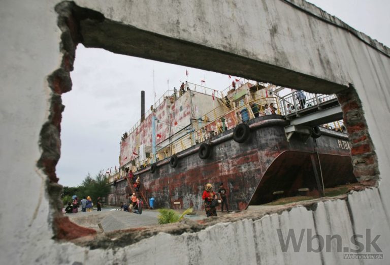Ľudia navštevujú obrovskú oceľovú loď, v ktorej po katastrofickom cunami sídlil jediný zdroj elektriny pre miestnych ľudí. Indonézia, Banda Aceh, 26. decembra 2014. Foto: SITA/AP