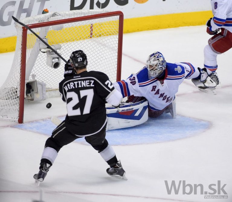 Obranca Los Angeles Kings Alec Martinez prekonáva brankára New Yorku Rangers Henrika Lundqvista počas piateho finálového zápasu NHL. Foto: SITA/AP