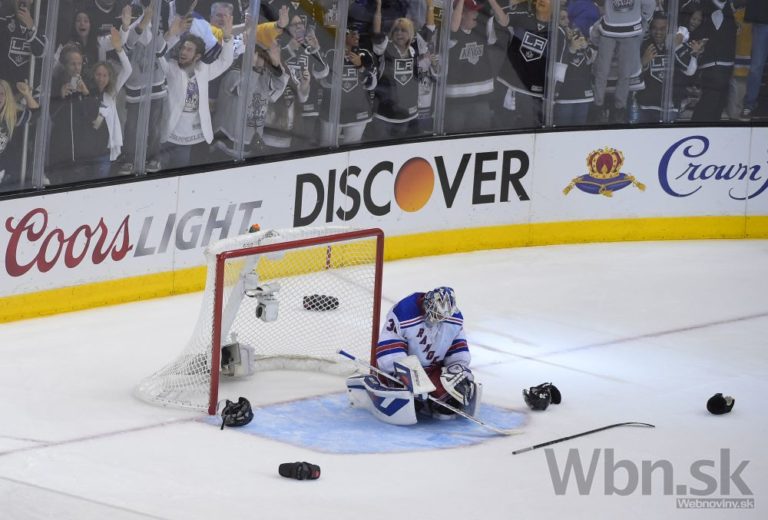 Brankár New Yorku Ranger Henrik Lundqvist sa smutne pozerá ako puk z hokejky obrancu Los Angeles Kings Aleca Martineza končí za jeho chrbtom počas piateho finálového zápasu NHL, v ktorom Ranger prehrali s 'kráľmi' 2:3. Foto: SITA/AP