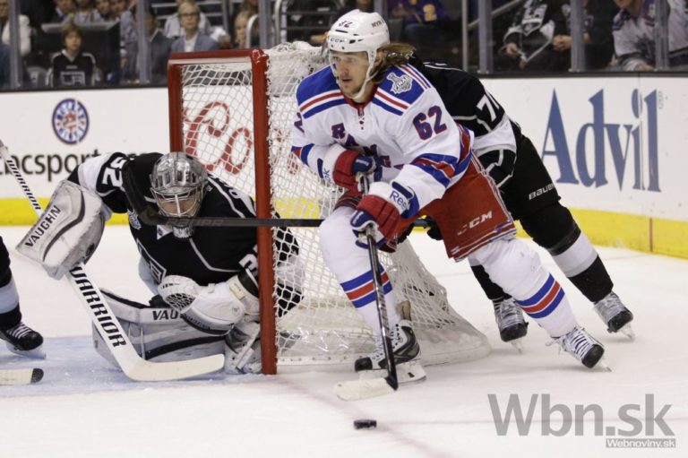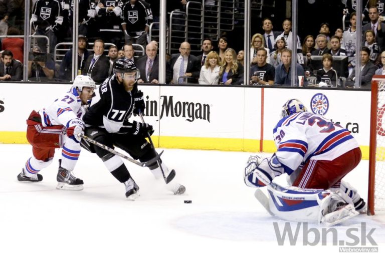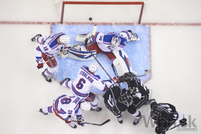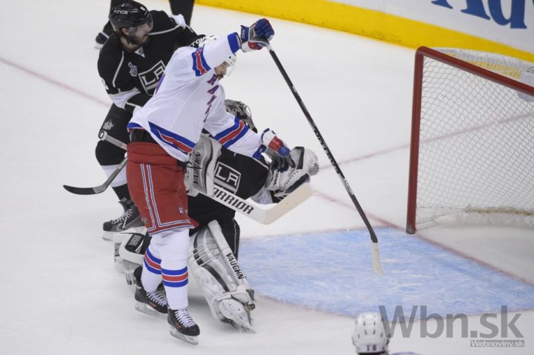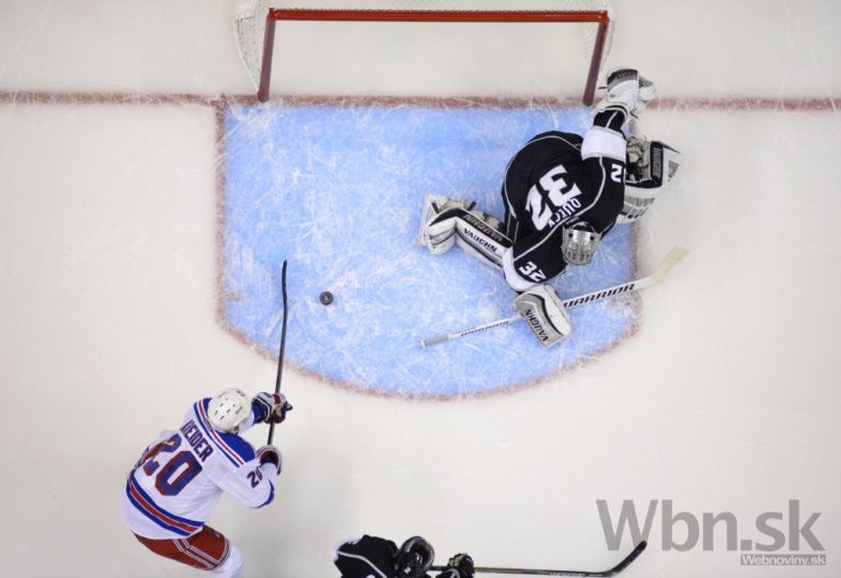 Útočník New Yorku Rangers Chris Kreider (20) prekonáva brankára Los Angeles Kings Jonathana Quicka počas piateho finálového zápasu NHL. Foto: SITA/AP