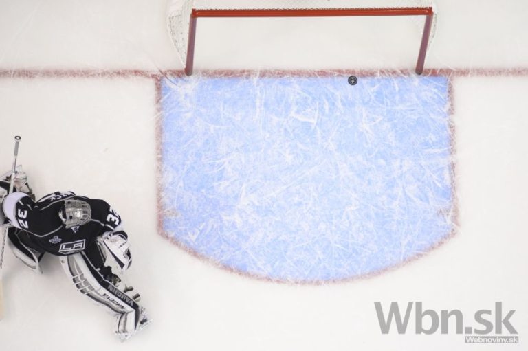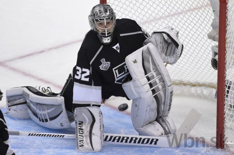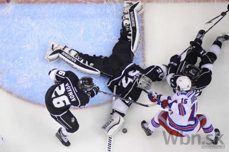 Zákrok brankára Los Angeles Kings Jonathana Quicka po strele jedného z hráčov New Yorku Rangers počas piateho finálového zápasu NHL. Foto: SITA/AP