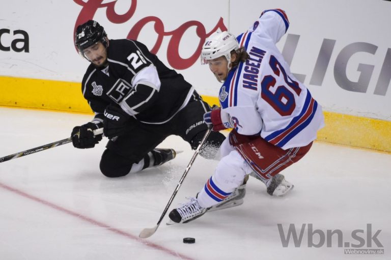 Obranca Los Angeles Kings Slava Voynov (26) v súboji s útočníkom New Yorku Rangers Carlom Hagelinom počas piateho finálového zápasu NHL. Foto: SITA/AP