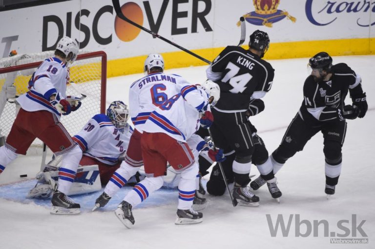 Útočník Los Angeles Kings Dustin Brown (23) sa snaží prekonať brankára New Yorku Rangers Henrika Lundqvista počas piateho finálového zápasu NHL. Foto: SITA/AP