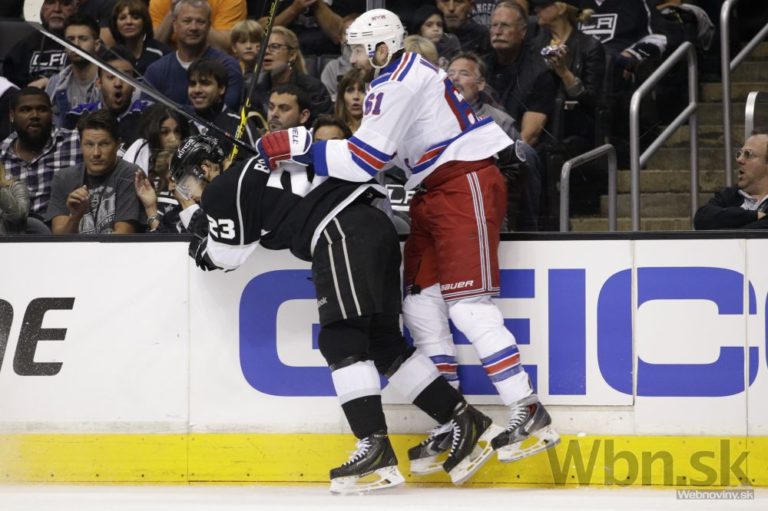 Útočník Los Angeles Kings Dwight King (74) padá po zákroku obrancu New Yorku Rangers Dana Girardiho (5) počas piateho finálového zápasu NHL. Foto: SITA/AP