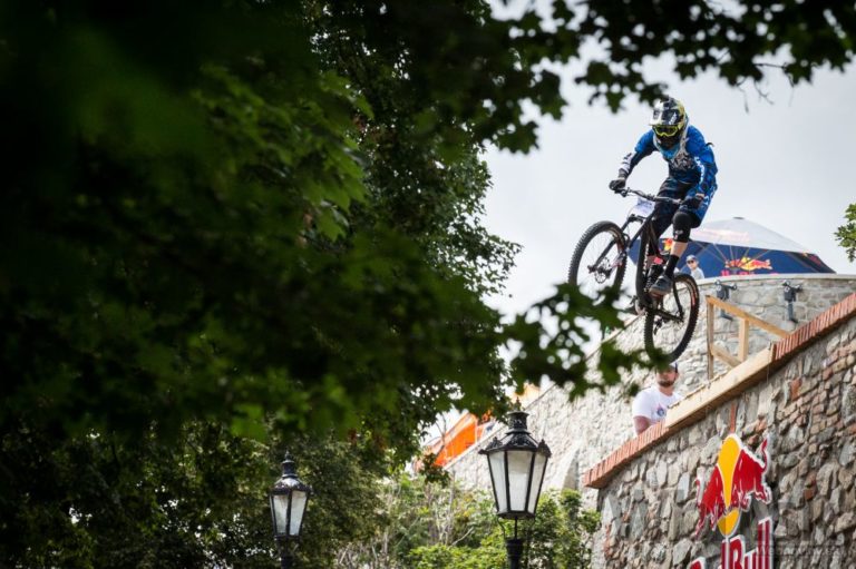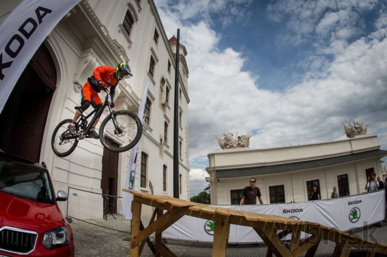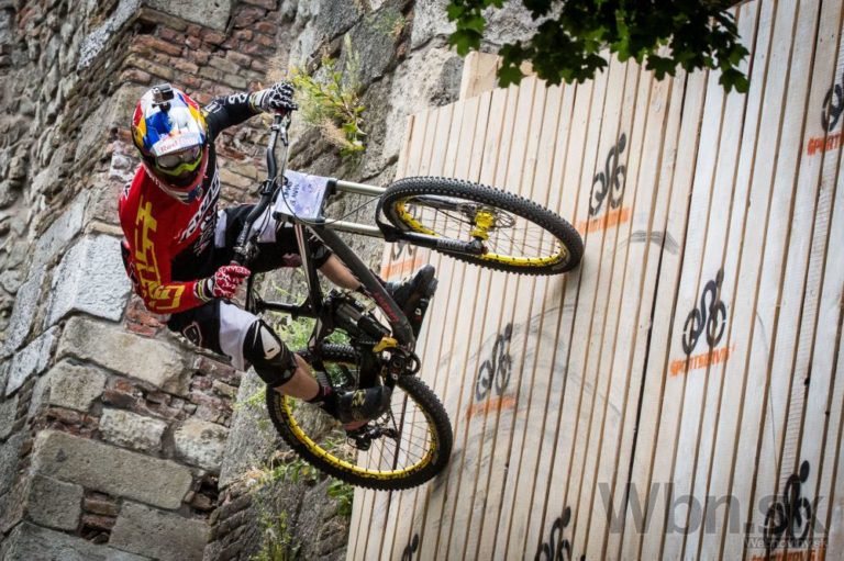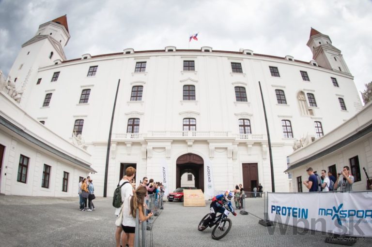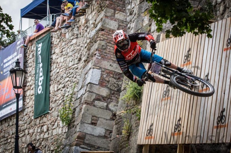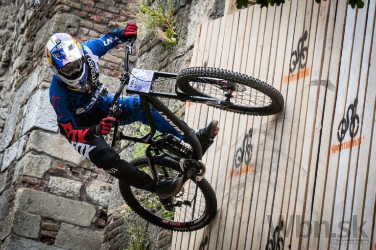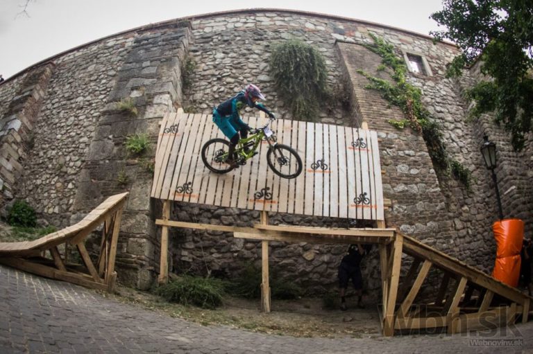Horský cyklista Filip Polc počas tréningovej jazdy v rámci 3. kola Svetového pohára v mestskom zjazde Bratislava City Downhill 2014. Bratislava, 21. jún 2014. Foto: SITA/Jozef Jakubčo