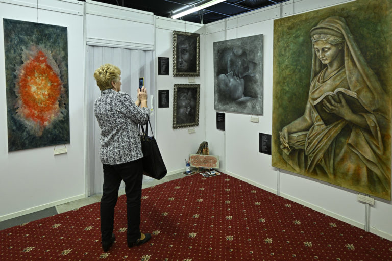 Návštevníčka si fotí expozíciu počas veľtrhu Bratislava SacroExpo Slovakia na výstavisku Incheba Expo v Bratislave, kde predstavili produkty a služby pre cirkvi, farnosti a veriacich. Bratislava 14. september 2023. Foto: SITA/Milan Illík