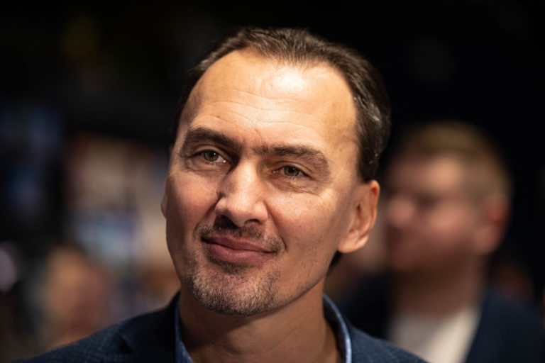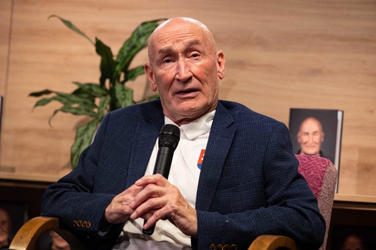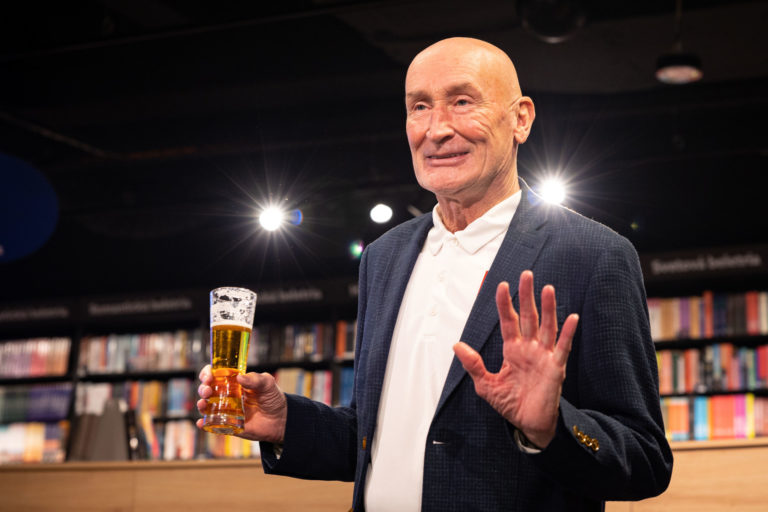 Pezident Slovenského zväzu ľadového hokeja (SZĽH) Miroslav Šatan počas krstu knihy Craig Ramsay Šťastný chlapec, ktorá dokumentuje päťročnú misiu trénera slovenskej hokejovej reprezentácie Craiga Ramsayho. Bratislava, 28. november 2022. Foto: SITA/Jana Birošová.
