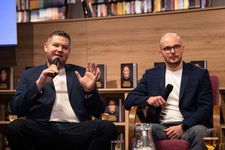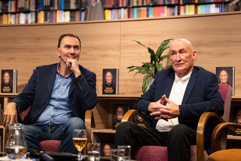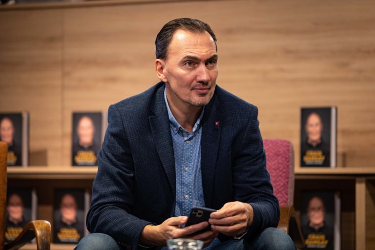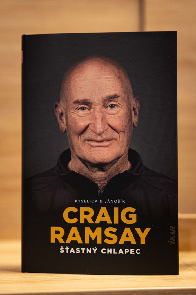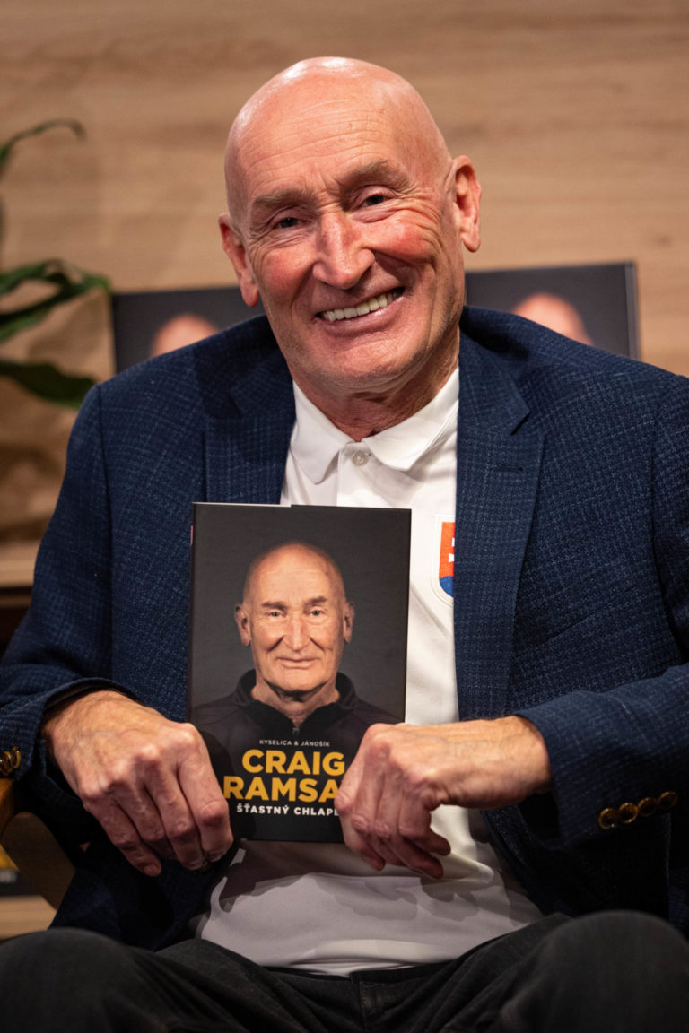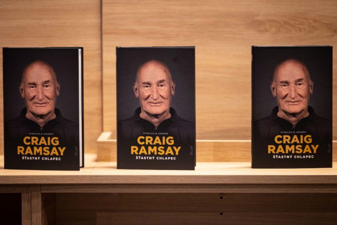 Kniha Craig Ramsay Šťastný chlapec, ktorá dokumentuje päťročnú misiu trénera slovenskej hokejovej reprezentácie Craiga Ramsayho počas svojho krstu. Bratislava, 28. november 2022. Foto: SITA/Jana Birošová.