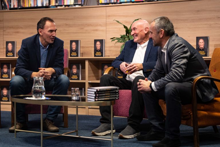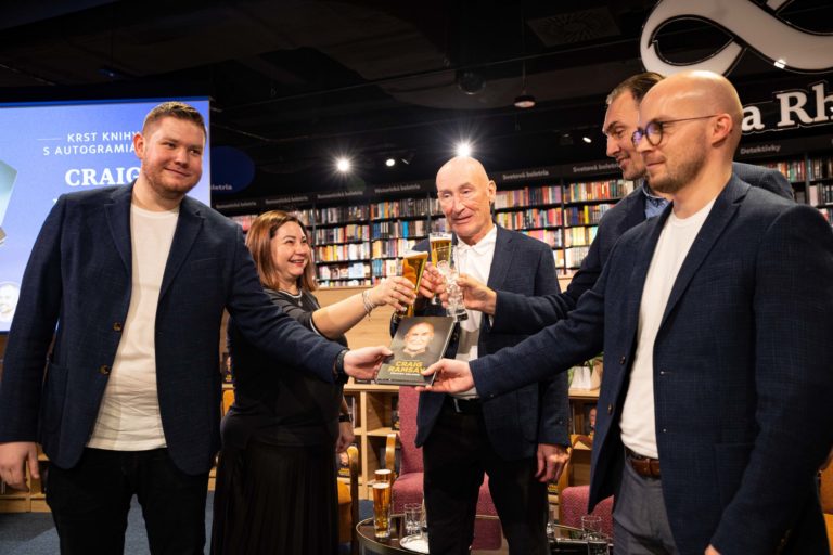 Tréner slovenskej hokejovej reprezentácie Craig Ramsay (uprostred) počas krstu knihy Craig Ramsay Šťastný chlapec, ktorá dokumentuje päťročnú misiu trénera slovenskej hokejovej reprezentácie Craiga Ramsayho. Bratislava, 28. november 2022. Foto: SITA/Jana Birošová.