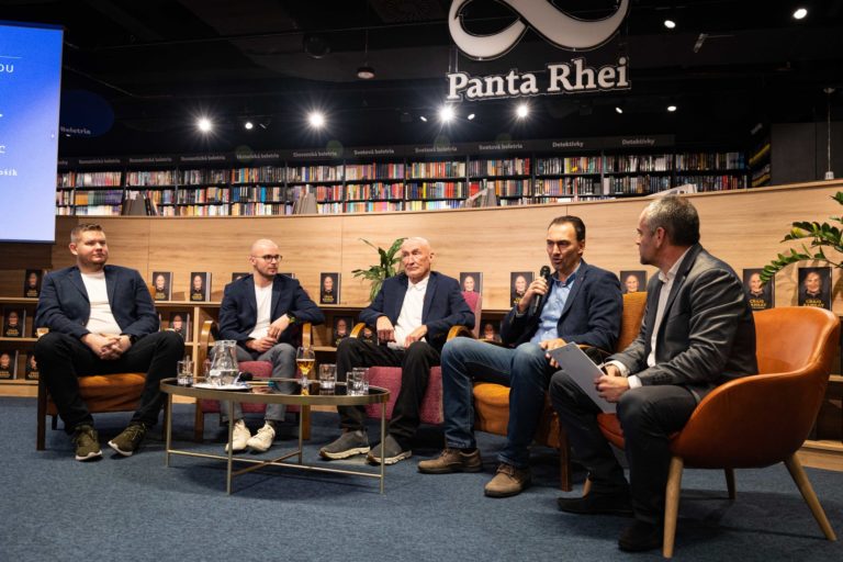 Zľava: Autori publikácie Tomáš Kyselica a Peter Jánošík, tréner slovenskej hokejovej reprezentácie Craig Ramsay a prezident Slovenského zväzu ľadového hokeja (SZĽH) Miroslav Šatan počas krstu knihy Craig Ramsay Šťastný chlapec, ktorá dokumentuje päťročnú misiu trénera slovenskej hokejovej reprezentácie Craiga Ramsayho. Bratislava, 28. november 2022. Foto: SITA/Jana Birošová.