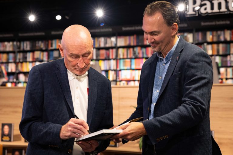 Zľava: Autori publikácie Tomáš Kyselica a Peter Jánošík počas krstu knihy Craig Ramsay Šťastný chlapec, ktorá dokumentuje päťročnú misiu trénera slovenskej hokejovej reprezentácie Craiga Ramsayho. Bratislava, 28. november 2022. Foto: SITA/Jana Birošová.