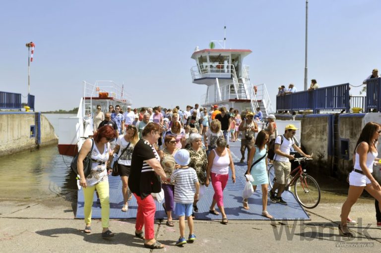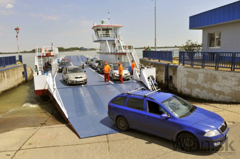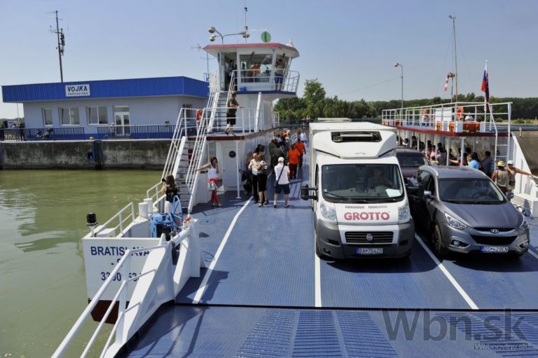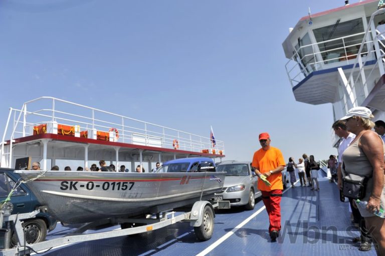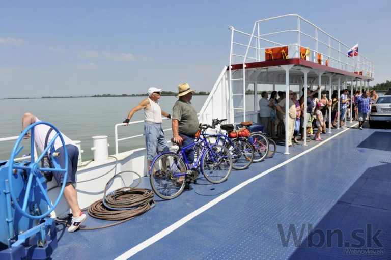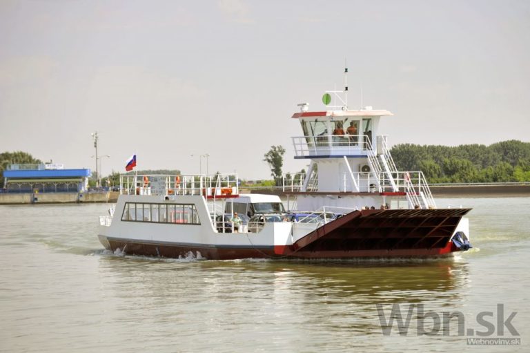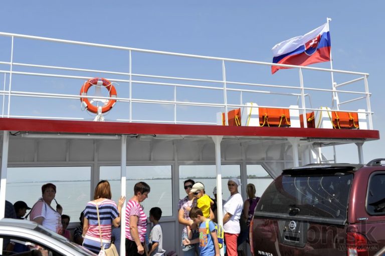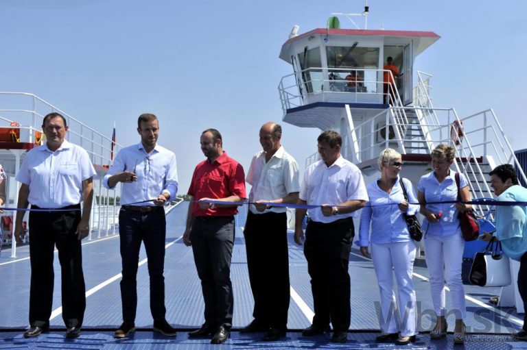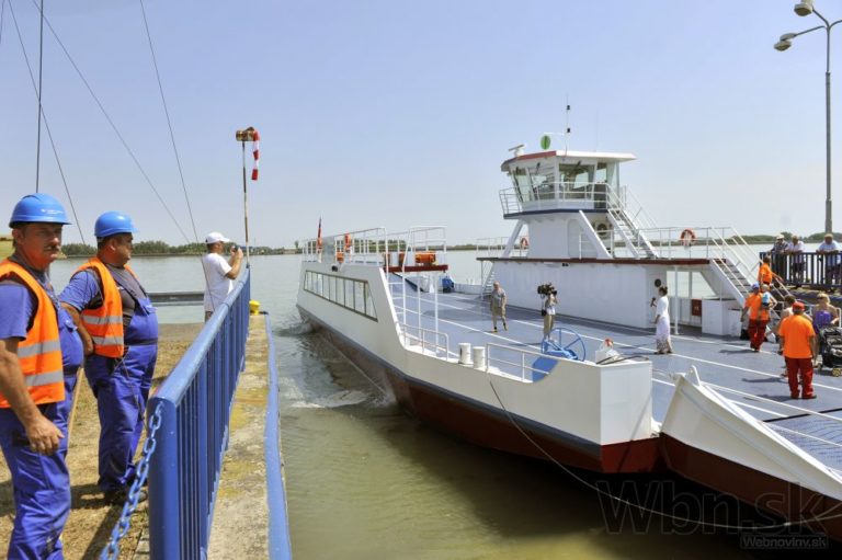 Nová dunajská kompa na prívodnom dunajskom kanáli na jednej z jej prvých plavieb medzi obcami Kyselica a Vojka nad Dunajom po slávnostnom krste. Vojka nad Dunajom, 1. júl 2015. Foto: SITA/Ján Slovák