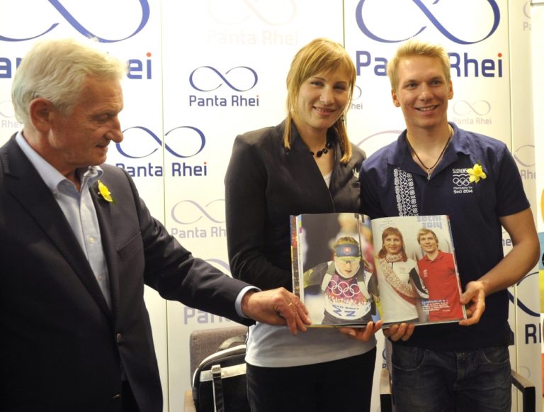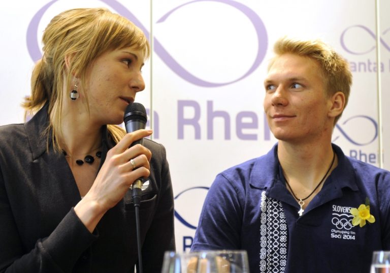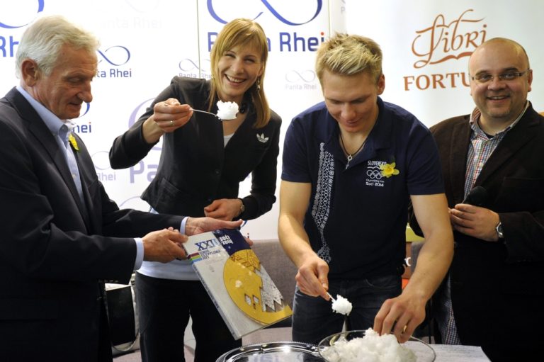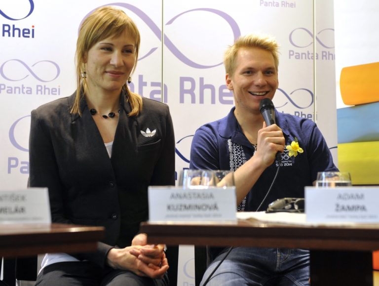 Zľava: Anastasia Kuzminová a Adam Žampa počas krstu publikácie XXII. zimné olympijské hry Soči 2014. Foto: SITA/Ján Slovák