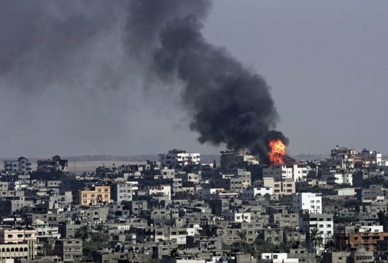 Dym stúpajúci z budov, ktoré zasiahli strely izraelských vojakov z hraníc Izraela a Pásma Gazy. Izrael, 12. júla 2014. Foto: SITA/AP