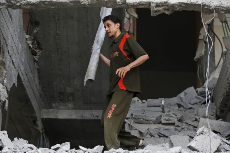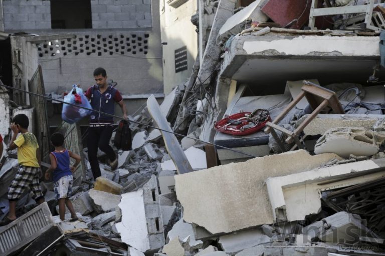 Palestínčania zachraňujú svoje veci z trosiek domu po rannom ostreľovaní v Pásme Gazy. Foto: SITA/ AP