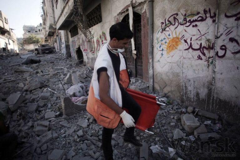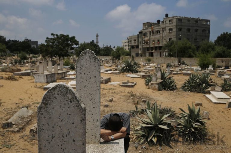 Počet obetí dvojtýždňového násilia dosiahol na palestínskej strane číslo 624. Izrael hlási 30 obetí vrátane dvoch civilistov. Pred izraelskými útokmi ušlo zo svojich domovov vyše 100 000 Palestínčanov. Foto: SITA/AP