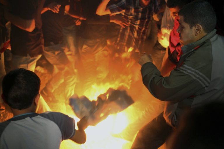 Prívrženci islamistického hnutia pália izraelskú vlajku pred ambasádou. Foto: SITA/AP