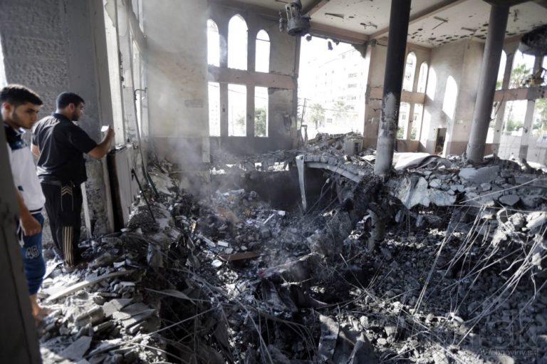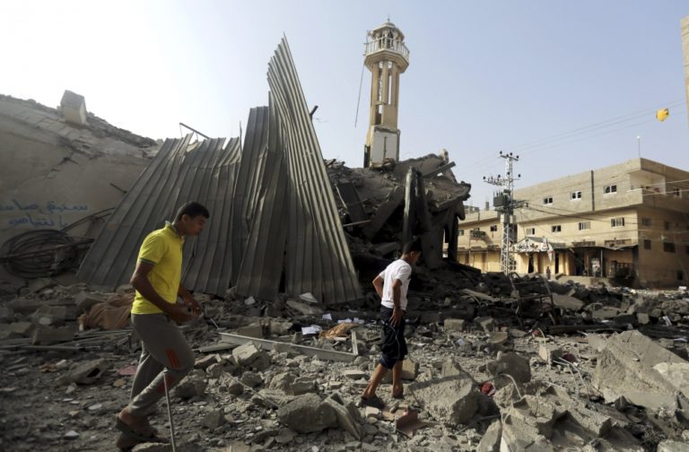 Palestínci sa zhromažďujú okolo zdevastovanej mešity, ktorú zasiahli izraelskí vojaci. Pásmo Gazy, 12. júla 2014. Foto: SITA/AP