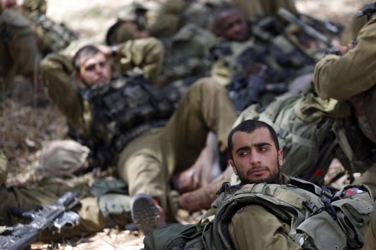 Izraelskí vojaci oddychujú pred odchodom do tankov, aby zaujali nové pozície na hraniciach Izraela a Pásma Gazy. Izrael, 12. júla 2014. Foto: SITA/AP