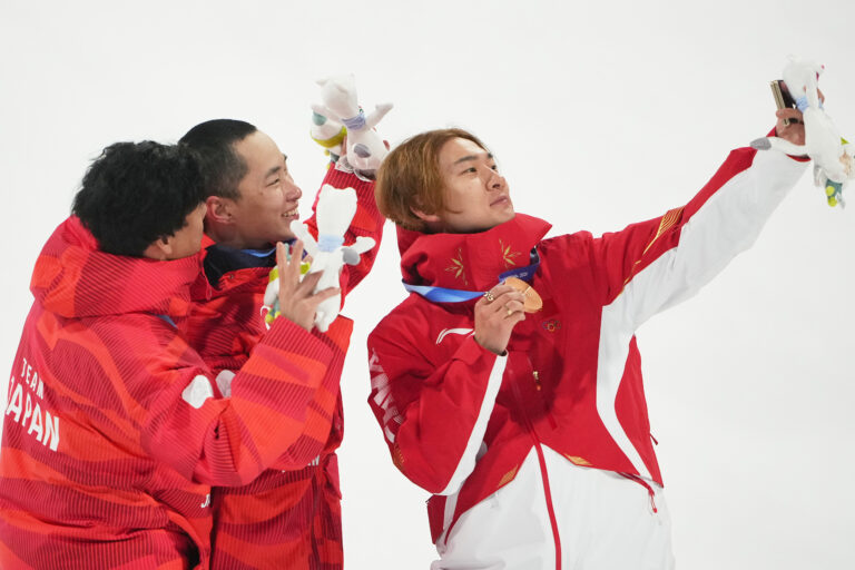 From left, silver medalist Japan's Ryoma Kimata, gold medalist Japan's Kira Kimura and bronze medalist China's Su Yiming celebrate after the men's snowboarding big air finals at the 2026 Winter Olympics, in Livigno, Italy, Saturday, Feb. 7, 2026. (AP Photo/Lindsey Wasson)