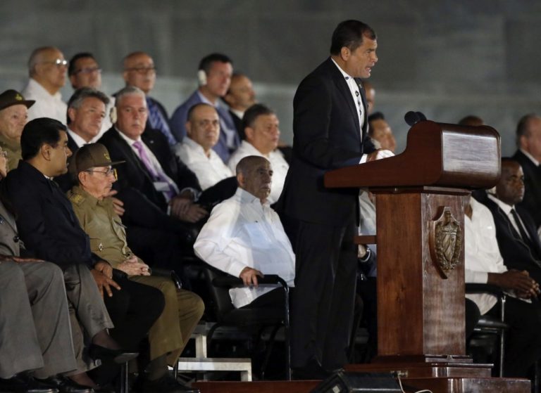 Prezident Ekvádoru Rafael Correa počas prejavu na Námestí revolúcie. Havana, 29. novembra 2016. Foto: SITA/AP