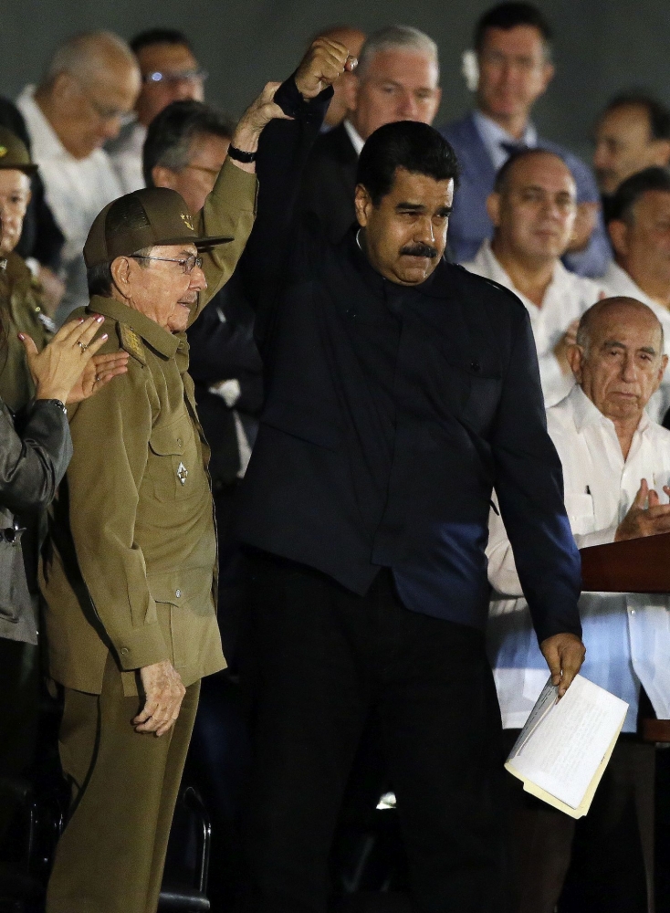 Kubánsky prezident Raúl Castro (vľavo) a venezuelský prezident Nicolás Maduro na havanskom Námestí revolúcie. Havana, 29. novembra 2016. Foto: SITA/AP